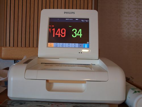 肚子上綁了兩條線,一條檢查娃娃的心跳,一條測量我的宮縮狀況